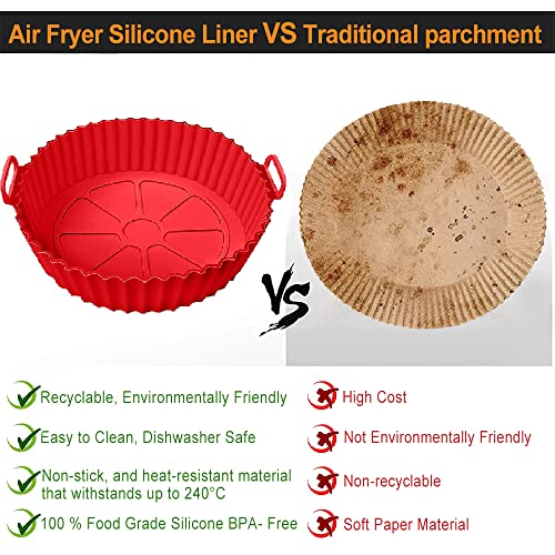 - 🍪 【 Heat Resistance 】 - Our air fryer liners reusable is made of food-grade silicone. Non-stick, non-toxic, heat resistant up to 464°F (240°C). Sturdy and flexible for multiple uses. Reusable silicone air fryer inserts are more environmentally friendly and save more than flammable disposable air fryer paper liners.