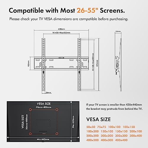• VESA MOUNT COMPATIBILITY: Min 50x50mm, max 400x400mm for 26-55" TVs. Bracket suitable for LED, LCD, 3D, Curved, Plasma, QLED, OLED & flat-screen TVs up to 45kg.