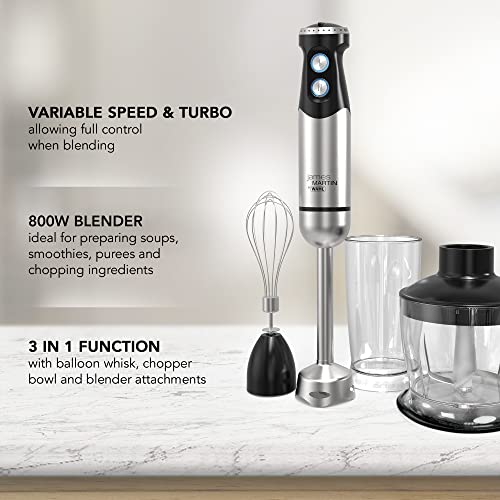 - 3-IN-1 FUNCTION – This handheld blender also comes with chopper and balloon whisk attachment, perfect for blending, pureeing, chopping and whisking. Use the chopper attachment for cutting up vegetables and nuts, the balloon whisk for eggs and batters and the hand blender for purees, baby food and soups