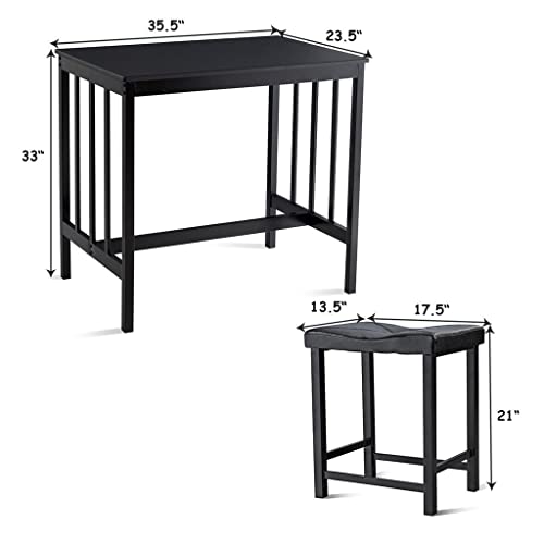 - The set features a simple rectangular table with long, strong legs, two backless counter stools, and a padded black PU seat cover.