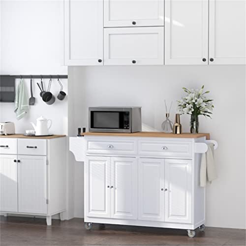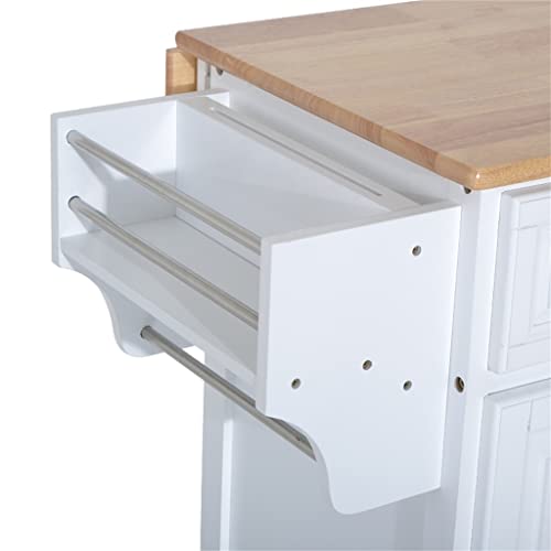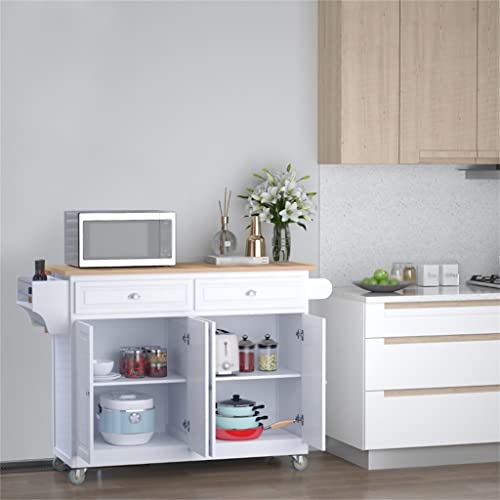 WALNUT Rolling Kitchen Island On Wheels Cart With Drop Leaf And Rubberwood Countertop, Storage Drawers, Door Cabinets