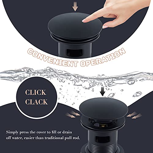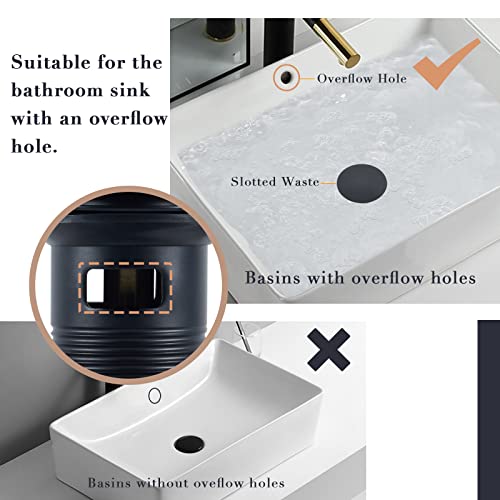 Product Description Click-Clack Basin Waste The basin plug is equipped with a premium pure brass spring so that it can be pressed and popped up smoothly and easily. Water can be stored and drained off more efficiently. What Kind of Bathroom Sink Is Suitable for? The slotted pop-up waste is only suitable for the basin sink with an overflow hole. Please kindly confirm whether your cloakroom sink has an overflow hole before purchase. 304 Stainless Steel with Matte Black Finish The modern basin sink plug is made of 304 stainless steel which is sturdy and anti-rust.The surface of the basin waste is painted with matte black waterproof and anti-corrosion coating to prevent peeling.