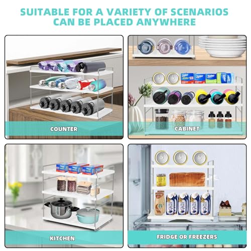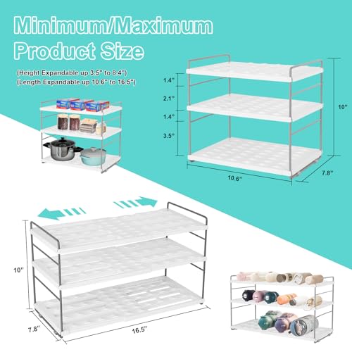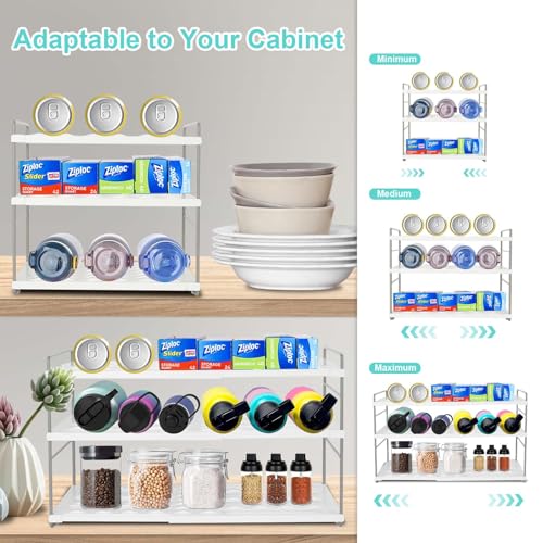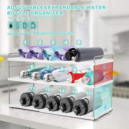 - 【Adjustable&Expandable】Our expandable 3 tier water bottle organiser can be extended from 10.6" to 16.5" and it can be adjusted to different heights (3.5 to 8.4 inches) according to the size and spatial position of the water bottle to meet different storage needs, maximizing storage area and vertical space.