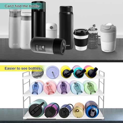 - 【Multi Purpose】Water bottle storage rack will make your kitchen,cupboard,countertop,and cabinets tidy from clutter. Perfect for use in kitchens,cupboards,cabinets,counters, countertops,pantry,restaurants.Used for storing water bottle,sports flask,champagne and wine bottles,soda bottles,spices,seasonings,canned goods,kitchen supplies,cleaning supplies,etc.to maximize your storage space.