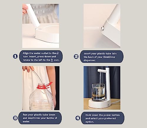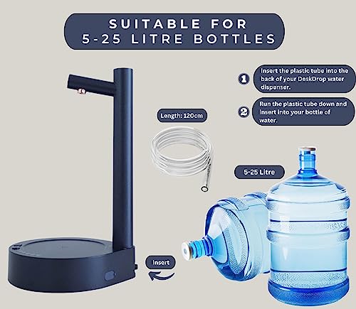 - Compatibility: The DeskDrop Water Dispenser fits seamlessly with water bottles ranging from 5 to 25 liters. Effortlessly connect the tube to your DeskDrop dispenser, effortlessly guiding it into your water bottle and ensuring a secure fit. Enjoy hassle-free hydration without limits.