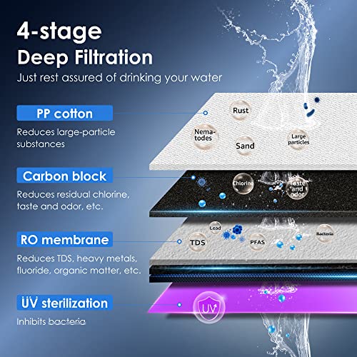 - 💧[4-stage deep filtration] The 3-in-1 filter of the RO instant hot and water dispenser is built with an RO reverse osmosis membrane, a carbon block and PP cotton, and can effectively reduce TDS, chromium, pfas, fluoride, arsenic, salt, heavy metals, nitrate, particles, chloride, and other harmful substances through fine filtration layer by layer to achieve deep purification, ensuring every drop is purified water.