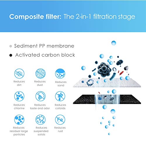 - Composite design: The 2-in-1 front filtration stage effectively reduces sand, rust, particulates, suspended solids, and other impurities, providing you with clean and pure water.
