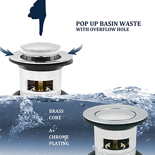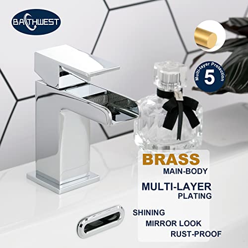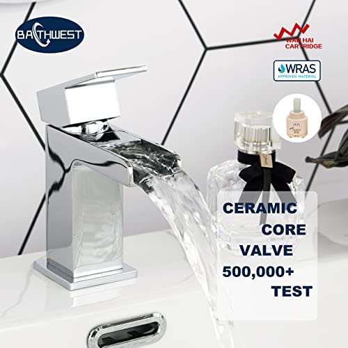 Waterfall Square Basin Taps with Pop Up Waste, BATHWEST Basin Mixer Taps with Drain, Monobloc Chromed Brass Basin Taps with Sink Plug 612-A-style