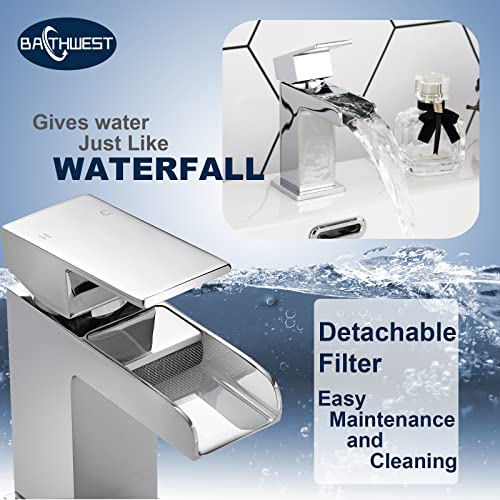 Home DIY & Tools Waterfall Square Basin Taps with Pop Up Waste, BATHWEST Basin Mixer Taps with Drain, Monobloc Chromed Brass Basin Taps with Sink Plug 612-A-style
