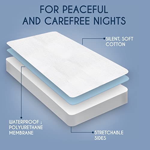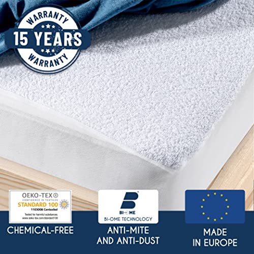 - BYE BYE WET MATTRESSES : Waterproof and highly breathable mattress protector with polyurethane membrane that perfectly blocks all fluids, sweat, urine and bodily fluids, while letting the mattress breathe. 70x140 cm refers to the size of the mattress, the dimensions of the protection may vary by a few centimeters to better fit the pillow.