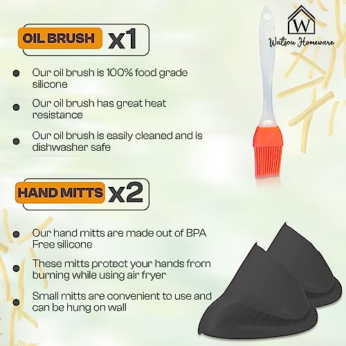 - 5 piece air fryer accessory set. 2 x air fryer silicone liners, 2 x sillicone mittens, 1 x sillicone oil brush. They're compatible with Ninja AF300UK & AF400UK dual air fryers.