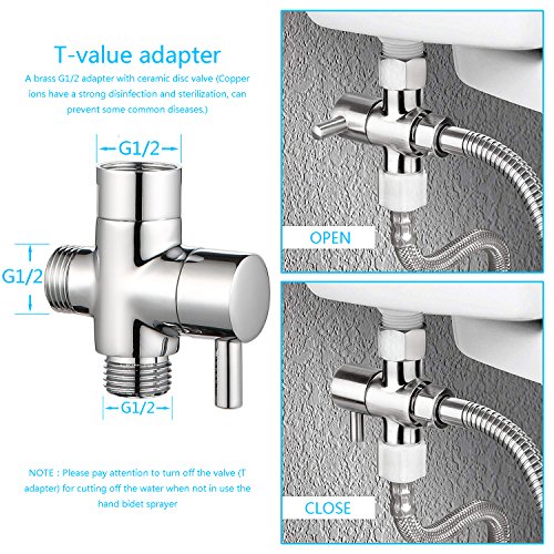 • CONTROL THE WATER PRESSURE - WEIDMAX hand held bidet sprayer provides great water pressure control, getting clean is convenient and frustration free without sprayer problems,a gentle bidet spray for use as a portable, hand-held bidet and a jet spray for cleaning tasks. Please note turn off the valve(T-adapter) to cut off the wate when not using the hand held bidet sprayer.
