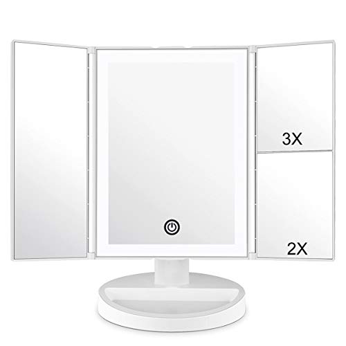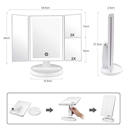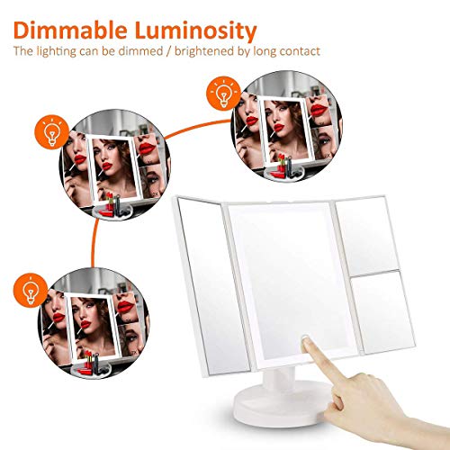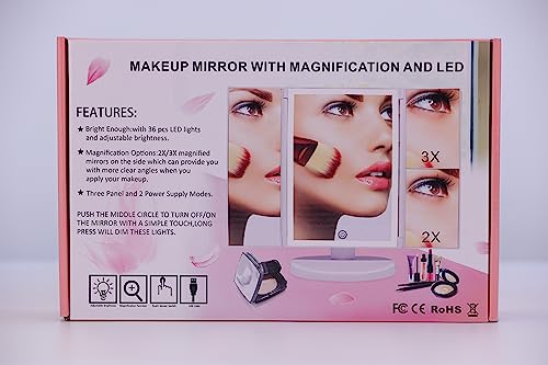 - 3 Magnifying Mode & Touch Screen Control: The illuminated cosmetic mirror is equipped with a 1X/2X/3X magnifying mirror. Ensure every detail of your hair and makeup are taken care of with the convenient zoom feature. With the touch screen control, you can turn on/off the light through short pressing and adjust the brightness through long pressing.
