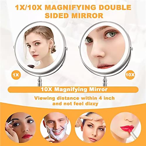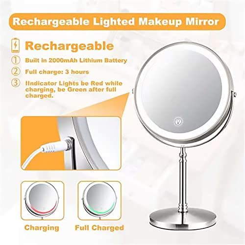 Product Description Why Choose our 8'' Rechargeable Countertop Vainty Mirror ? Smart touch to turn on/off.Double side mirror with 1X/10X Magnification.360°rotatable design and extendable arm.3 color models and adjustable brightness,can be adjusted to any light you want.Rechargeable design, built-in battery and wireless, no need to replace the battery. Convenient charging function: Our bathroom mirror has a built-in 2000mA battery, can be used wirelessly after fully charged. Charging indicator: Red in charging, Green in fully charged. Tips: Our mirror can be fully charged in 2 hours and continuous working for 8 hours.2The charging port is at the connection between the bracket and the mirror. The mirror can also be rotated during charging.