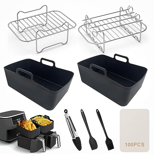 - 【8-pcs of Accessories】-To meet your cooking needs, these air fryer accessories includes Air fryer silicone liners*2 , Metal rack*1, Skewer rack*1, Silicone tong*1. Food Clip*1, Oil Brush*1, 100pcs liners for air fryer baskets, you can get all the things from us,no need to spend more time to buy.(Please kindly measure the air fryers’ size before your purchasing.