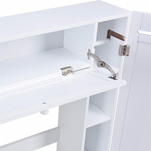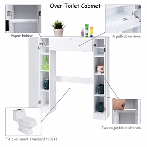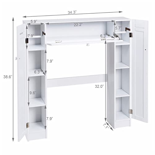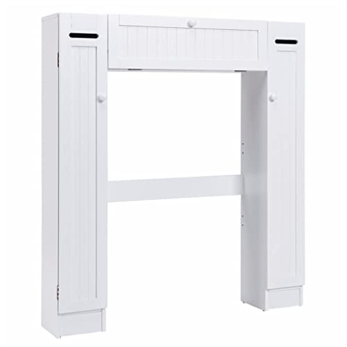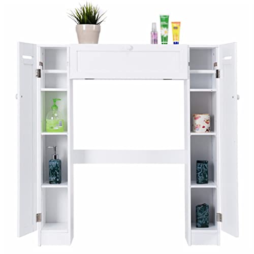 - This bathroom space saver features sturdy MDF construction and its white finish ensures that it will match and accent any existing decor.