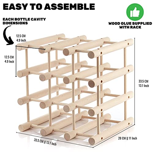 - Dimensions of wine rack assembled as on images: H 33 cm x L 33 cm x W 28cm. One bottle module unit is 12cm x 12cm - based on that you can calculate size based on your custom requirements