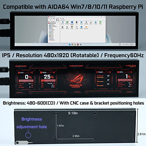 - IPS Full HD 8.8 Inch LCD Screen for PC Case / Resolution 1920x480 / Refresh Rate 60Hz / Touchable(please select the touch version option) / Brightness Adjustable: 480-600(CD) / with Positioning Holes / Horizontal Vertical Rotatable Secondary Screen