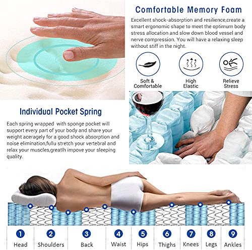 - 【Ergonomically related】The independent springs are carefully designed for the 9 body zones (feet, ankles, legs, knees, hips, waist, shoulders, neck and head) and the support points of the mattress are intelligently matched to body shape and sleeping position. Suitable for supine, side and stomach sleepers. The mattress's three-layer structure improves pressure distribution and provides excellent lumbar support.