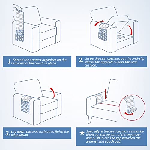 - 【Easy to Use】The end of the sofa armrest organizer has a foam strip built in to hold it more securely to the armrest. Put the end of remote control holder under the sofa cushion, and then pass the other end around the sofa armrest so that the hand can just get the contents of the pocket, the sofa armrest organizer will never slide off when the other end is pressed