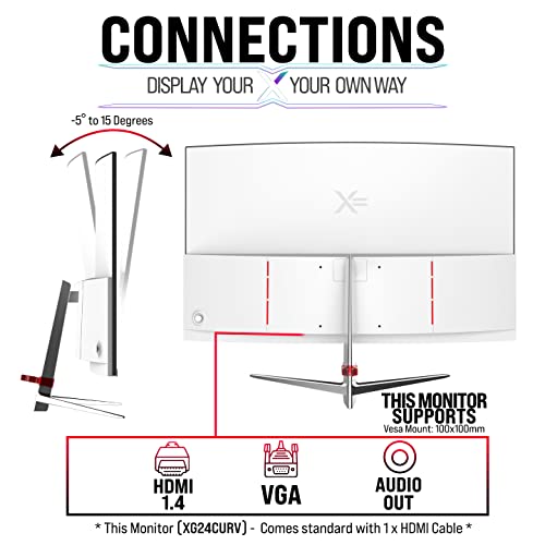 Product Description X= XG24CURV-W 23.8" Curved Full HD VA 75Hz Adaptive-Sync/FreeSync HDMI WHITE Gaming Monitor Experience the best of both worlds with X= Monitors With cutting-edge technology and innovative features, X= delivers the ultimate monitor experience that caters to your gaming adventures and professional endeavors. X= XG24CURV-W 23.8" Curved Full HD VA 75Hz HDMI Gaming Monitor - WHITE X= True Gaming Performance with a 1920 x 1080 Pixel VA Display & 75Hz Refresh Rate. Play Your Best Game! X= True Gaming Performance X= XG24CURV 23.8" Curved Full HD VA 75Hz Adaptive-Sync/FreeSync HDMI Gaming Monitor Play In Style in-game & out! Need to match your all-white set-up? Full HD WHITE Curved Panel for Total Immersion - with Response and Refresh Built for eSports! Key Features: Stunning 1920 x 1080 16:9 Curved VA Display Adaptive Sync Technology to prevent screen tearing HDMI and VGA inputs 100mm x 100mm VESA Mount-able Built for eSports Low Response Time and High Refresh Rates - Gives you the competitive edge to dominate the competition in-game. Follow the Curve! The Curved panel helps you focus in on your target - whether gaming, streaming, creating or just chilling - immerse yourself completely. Adaptive Sync Support for your graphics adaptive sync compatible technology for ultra smooth tear-free gaming with uncompromised quality. X= Gaming X= High Performance for Gamers Everywhere. Designed for professionals in various industries, this cutting-edge monitor offers exceptional performance and stunning visuals.