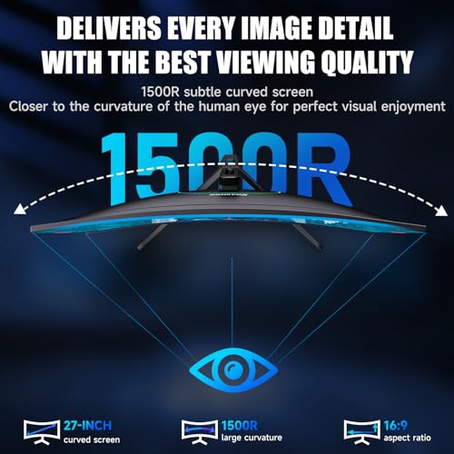 • 【QHD 1500R Curved Monitor】27inch 2560×1440, Quad-HD curved monitor,high resolution and ultra-fast 165Hz refresh rate, 1ms response time, The 1500R degree curved design let you see more content without excessive head movement,elevate your gaming experience.