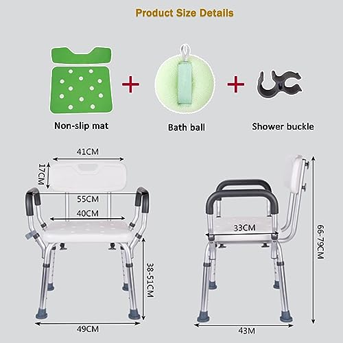 Product Description xixi-home Shower Chair with Arms Shower Seat Perching Stool Features: 1. Made of high-quality aluminum alloy material, PE backrest and seat, waterproof, anti-corrosion, not easy to rust 2. There are armrests on both sides of the board, easy to move 3. Ergonomic seat board and backrest, comfortable for sitting and lying 4. Thickened leg tube can bear 350lbs, more stable and reliable 5. Can be used as a bath stool or ordinary household chair, suitable for many places, such as bedrooms, bathrooms, hospitals, etc. Aging becomes a trend. For those elderly who live alone, safety becomes an important issue. This elderly bath armchair can largely avoid the risk of slipping in the bathroom. It is made of high-quality plastic, rubber and aluminum alloy, which is durable and can be used for a long time. At the same time, a non-slip mat is provided to ensure its non-slip performance, especially suitable for bathroom use. Installation Method Material: aluminum alloy Color: white Adjustable height: (38~51)cm Back Dimensions: (41 x 17)cm (L x W) Weight: 3.89 kg Weight capacity: 350 lbs The package includes: 1 x bath chair 1 x non-slip mat 1 x Bath Ball Precautions: Please do not use this bath chair on an uneven bathtub or other uneven ground!