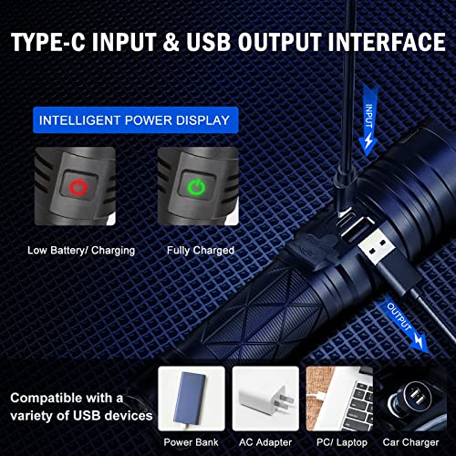 - ✅【LONG LASTING 5000MAH BATTERY & USB CHARGING】: This rechargeable torch is equipped with a 5000mAh 26650 battery that provides up to 8 hours (Low Mode) of continuous lighting. With a built-in Type-C charging port, this LED torch rechargeable can be connected to USB ports on computers, power banks and other devices to charge rechargeable batteries. Surprisingly, this powerful torch has a USB output to recharge mobile phones and other digital devices