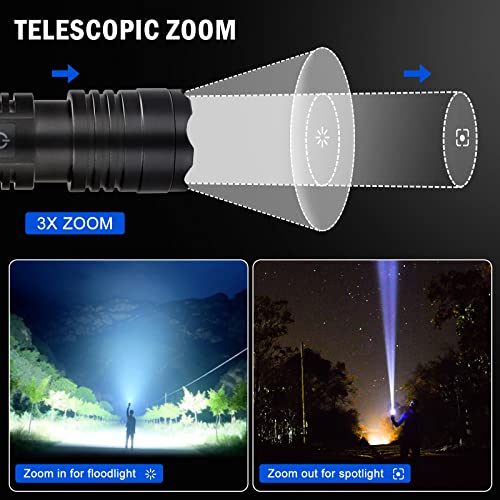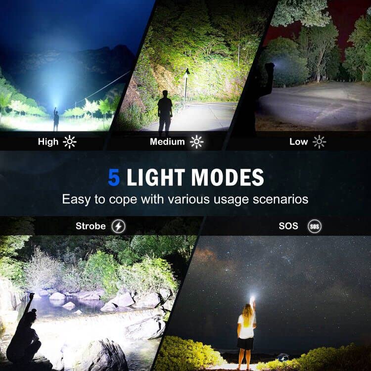 - ✅【ADJUSTABLE FOCUS & 5 LIGHT MODES】: Push and pull the lamp head of the flashlight can adjust the focal length and beam size, which can be freely switched to a long-range spotlight or a wide illumination floodlight. With 5 light modes: High, Medium, Low, Strobe and SOS, this tactical torch can easily handle different application scenarios. In any mode, press and hold the on/off button for 3 seconds to turn off the torch light without switching through all modes