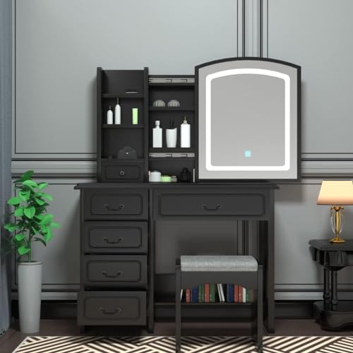 - Large Capacity Storage】6 drawers, one drawer has four compartments. Your cosmetics, jewelry and other beauty items can always find their place easily. The full-length mirror doors can be opened to provide additional storage space inside. (And the tall mirror cabinet with drawers can be placed to the left and right depending on your needs.) (Stool not included/just for display).