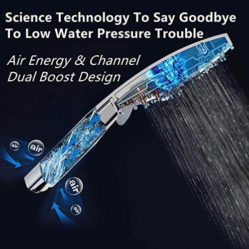 - 【Double Boost Pressure Design】Air Energy and Channel Boosting : Air enter the interior of the shower head and mixed with water then through a flow channel with a specially pressurized design to increase the pressure of water again to say goodbye low