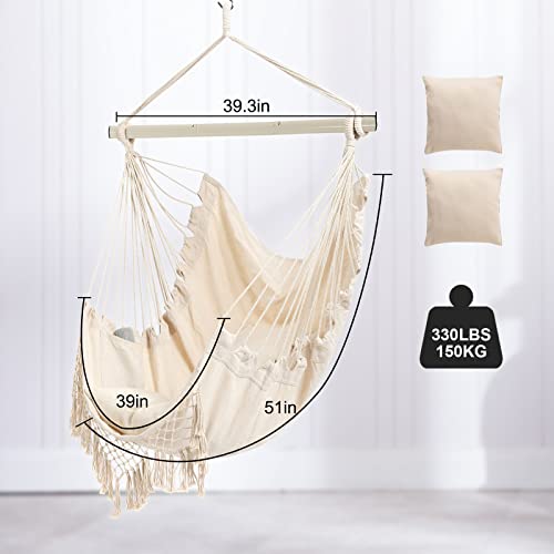 - Dimensions- Metal Rod about 100 cm long, about 130cm inches high chair.The 2 cushions, will give you extra comfort.This hanging chair swing can support up to 150kg weight