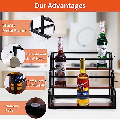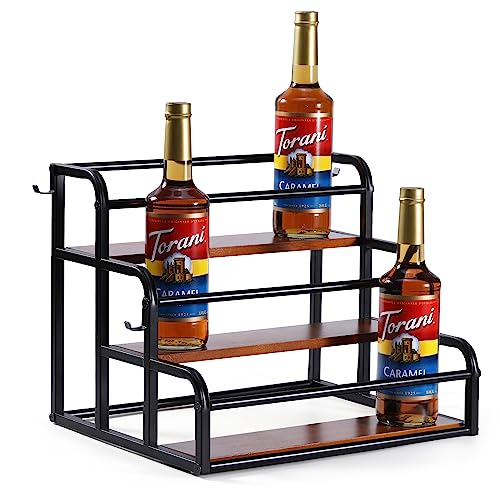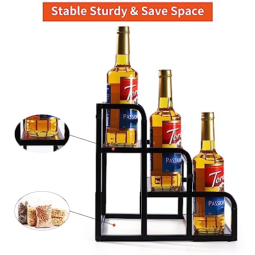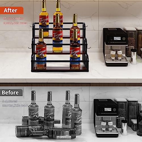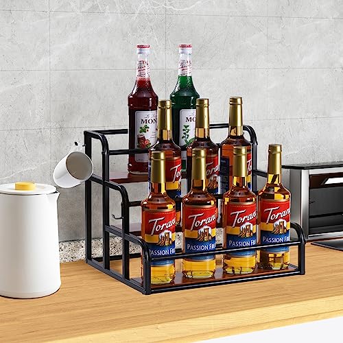 - 🍾LARGE CAPACITY RACK: You will receive a coffee syrup bottle holder stand and four hooks. The 3-tier syrup rack organizer holds up to 12 syrup bottles (750 ml/1000 ml), comes at the perfect size of 15.3*13.3*14.9 in, each tier depth of 4.2 in. Very sturdy and makes it also easy to pump the syrups in the back row. Keeps everything looking organized.