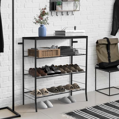 - High quality material: The top of the shoe storage is made of high quality MDF wood, which can hold up to 20 pounds. Shoes are stored on a shelf made of sturdy metal mesh that can hold up to 10 pounds.