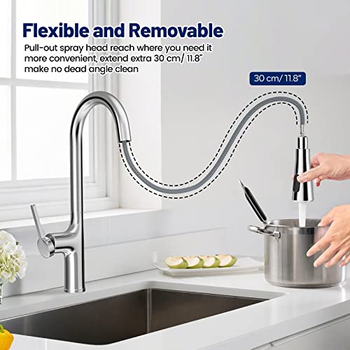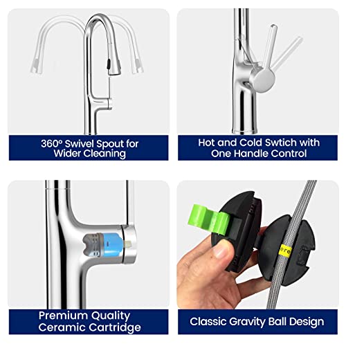 - 💦【Full Range Washing】 The pulldown spout extends up to 30 cm/ 11.8" so that it could easily reach every corner of a large, divided kitchen sink, making a wide range of cleaning easier and more flexible. When released, the hose quickly and securely retracts with the updated gravity retracting system. 360° swivel function also allows for full flexibility in the kitchen, allowing you to move the pull down kitchen tap when required to fit larger items into your sink.