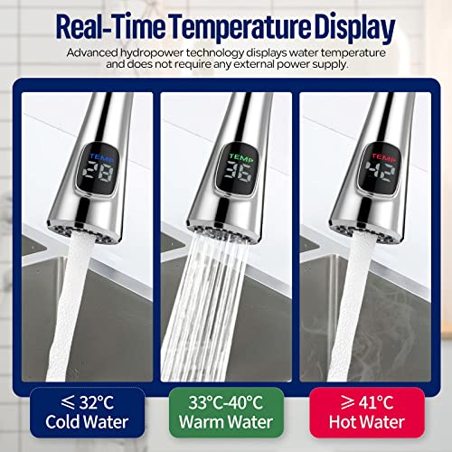 - 💦【Digital Temperature Reading】 Advanced hydropower technology does not require any external power supply, allows you to monitor the temperature of the water as it flows through the water tap. Weak current design, energy saving, environmentally friendly, safe, no fear of electric shock risk. The temperature light ≤32℃ shows blue, 33℃- 41℃ display green, and ≧42℃ display red, useful for households with children or elderly individuals as it helps prevent scalding accidents.