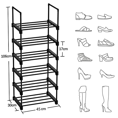 Product Description Package Included: 2 x 6-Tier Shoe Racks 1 x Instruction 2 x PP Pads 1 x Rubber Hammer Specifications: Colour: BlackMaterial: Iron Pipe, Plastic ConnectorSize: 45 x 30 x 106 cm (L x W x H)Weight: 4 kg BIGLUFU High-Quality 6-Shelf Shoe Rack Bring order to your spacestackable to save spaceAiry design avoids the accumulation of unpleasant odour Max. Static Load Capacity per Shelf: 5 kg Max. Overall Capacity: 24 Pairs Warming Tips When assembling and disassembling, please wear gloves to avoid accidental scratches. Stable and Durable These sturdy storage racks are supported by four reinforced sprayed steel tubes per level, which are strong and rust-resistant, providing a stable perches for your shoes. Quality Connectors Reinforced by quality plastic connectors, this shoe rack is even strong enough to house your shoes. Easy to install Easy to assemble with plastic connectors and iron tubes, a shoe rack can be easily assembled by following the instruction. DIY Design You can assemble the product according to suit your needs. You can get a shoe rack with different heights - up to 12 tiers or one shoe rack featuring 2 x 6 tiers attached. You can also use 2 small 6-tier shoe shelves separately.