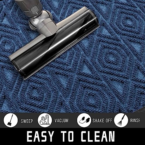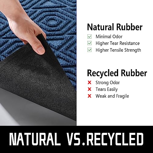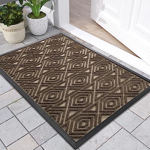 - [CAPTURE DIRT AND MOISTURE] Yimobra front door entryway mat outdoor with unique pattern design, forming a detention dam extending in all directions, helping to capture dirt, dust, gravel, mud, sand, grass or other messy debris and prevent them from entering Indoor; The surface of floor mat beautifully woven polyester fabric absorbs moisture, and the durable oblique rubber edge will not accumulate water in rainy and snowy days, keeping your home dry and clean