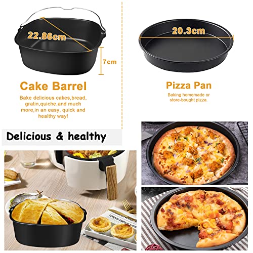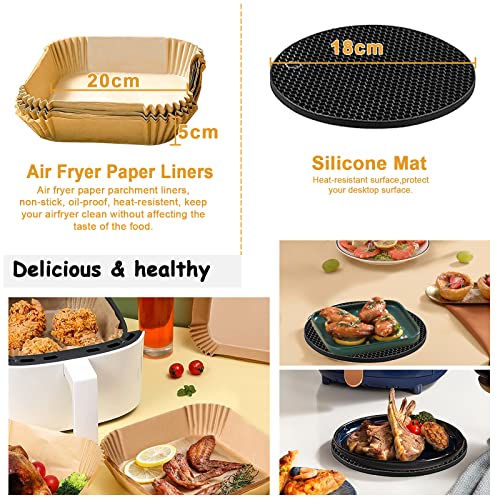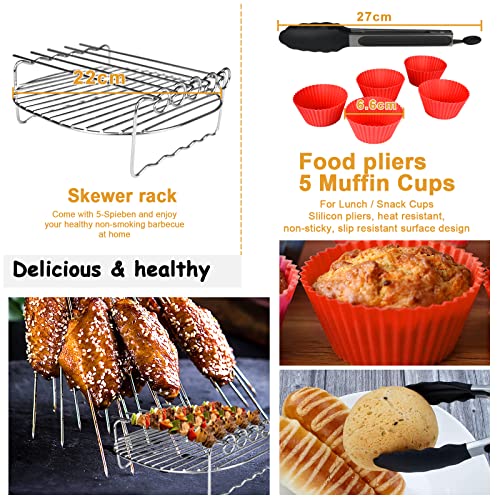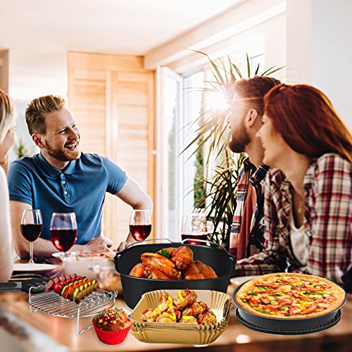- [What You Will Get]: 1x Nonstick Cake Pan, 1x Nonstick Pizza Pan, 1x Stainless Steal Multipurpose Rack with 5 Skewers, 100x Air Fryer Liner, 5x Silicone Muffin Cup, 1x Silicone Mat, 1x Food Tong, 1x Recipes. Various accessories can work together to bring you more cooking options and enjoy more cooking fun.