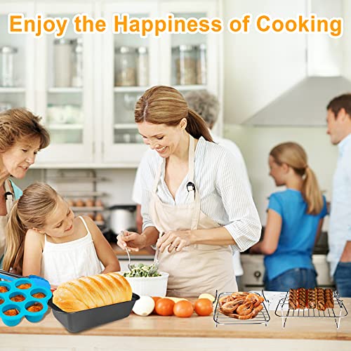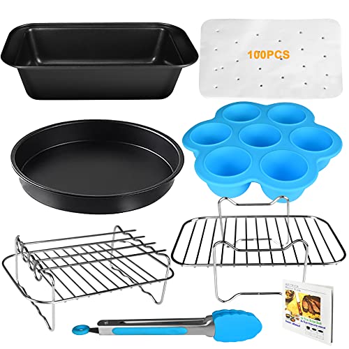 - 💖[What You Will Get]: 1x Nonstick Loaf Pan, 1x Muitl-purpose Rack, 1x Skewer Rack with 4 Skewers, 100x Air Fryer Liner, 1x Egg Bite, 1x Food Tong, 1x Recipes, 1x Pizza Pan. Various accessories can work together to bring you more cooking options and enjoy more cooking fun.