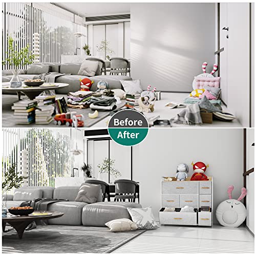 - UNIVERSAL MATCH- Premium dark grey fabric drawers, sturdy white metal frame and waterproof wooden tabletop give the storage organizer a modern style. This unit easily fits in various living spaces: living rooms, bedrooms, hallways, entryways, closets and nurseries, etc.