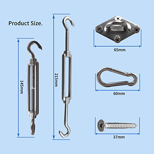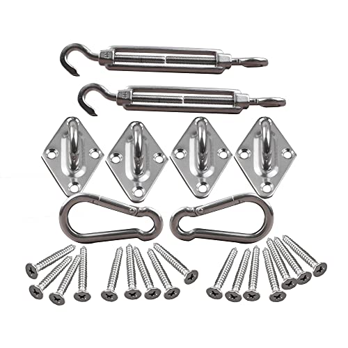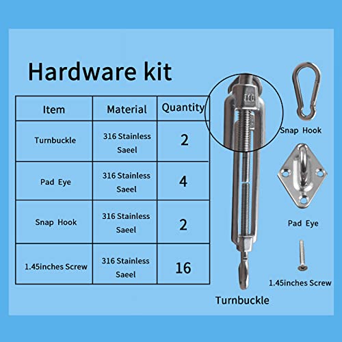 • All You Need Shade Sail Hardware Kit in it: Turnbuckle x 2, Diamond Pad eye x 4, Carabineer/hook x 2, Screw x 16.