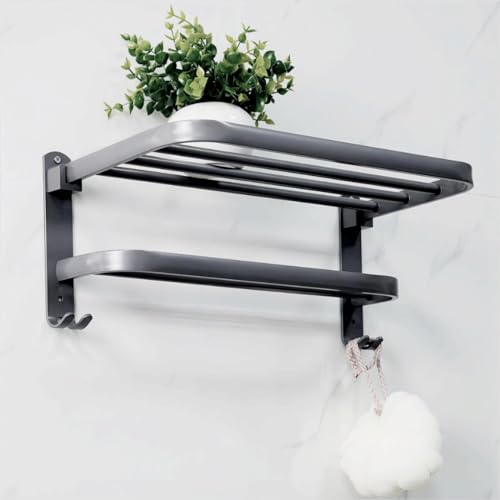 Home Bathroom Furniture yozhch Black Towel Rail Wall Mounted Towel Rack Bathroom Towel Holder Self Adhesive Towel Rail with Shelf 90° Foldable 2 Tier Towel Bar (58cm)