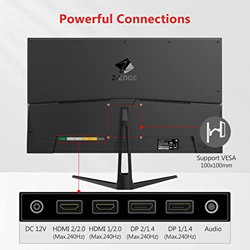 Product Description Z-Edge 27 Inch 240Hz IPS Gaming Monitor - 1ms, FreeSync, HDMI & DP Ports, Built-in Speakers, Support VESA mount Please note: In order to get 240Hz refresh rate, make sure the graphics card of your device supports 240Hz. Check your system before purchasing.Connect a game console(for example PS4/5) to this monitor, you can only get refresh rate up to 120Hz as game console supports up to 120Hz only. Some games only support 60Hz. Please refer to the settings of the game console and the game itself.