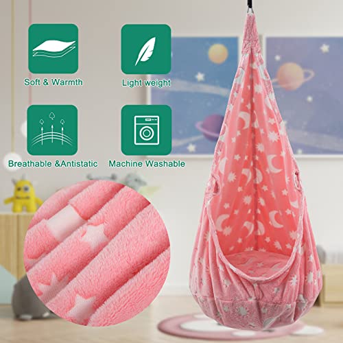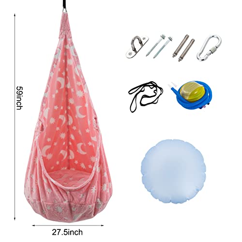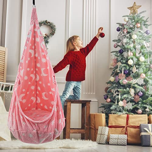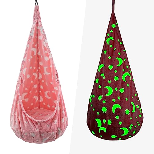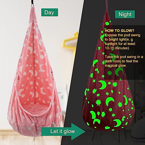 - Fun-Our glow in the dark pod swing can surprise your kids on birthday, Christmas, Halloween, Easter, Thanksgiving or any occasion. The soft and glow hanging hammock chair can inspire kids to come up with interesting ideas. Our indoor swing not only helps to give children a sense of security, which can help them to regulate sensory and relax, but also provides children with a fun play space and a quiet and comfortable place to rest.