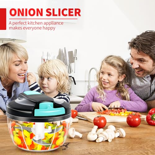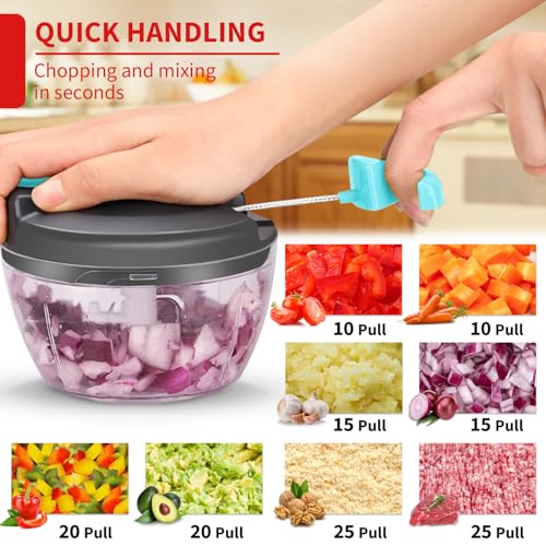 - 【SUITABLE FOR KITCHEN】The food chopper can be used to chop vegetables, fruits, meat, etc. Onion cutter is a good helper for the kitchen.You can control the size of foods by controlling the number of times you pull string. Food choppers and dicers10 times for coarse chopping, 15 times for medium, and 20 times or more for puree. What’s more, You can get chopped Onions in seconds without crying, and chopping garlic without smell.