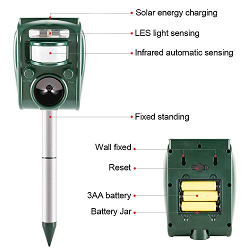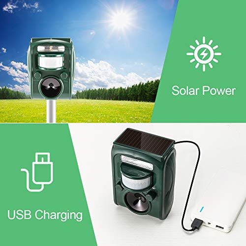 - 【Two Power Supply Modes】Ultrasonic animal repeller supports solar power supply and USB charging (including 3 AA batteries and USB data cable). Please fully charge the battery before first use to prolong the life of the battery.
