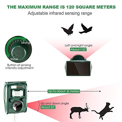 - 【Wide Coverage】Infrared PIR motion sensor with an angle of up to 110 degrees and a detection range of up to 10 meters/33 feet. When a moving animal is detected, the cat repellent is activated and emits a high-frequency sound that is irritating to small animals.