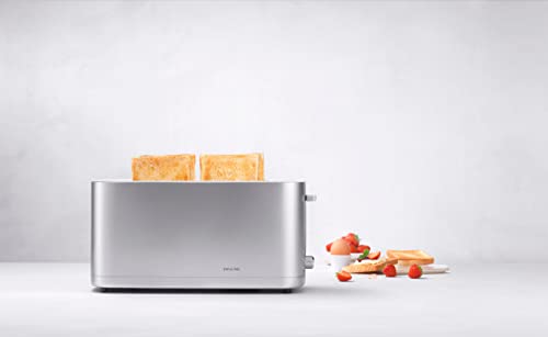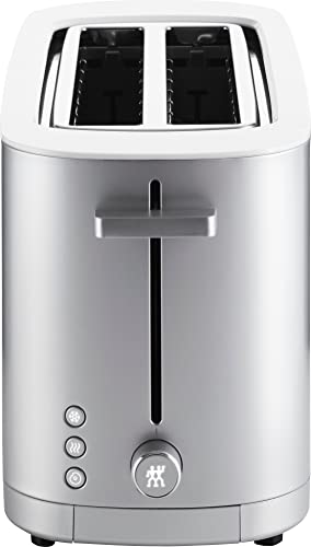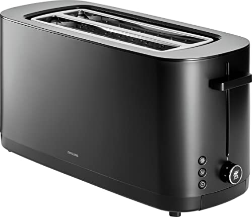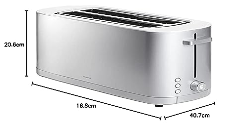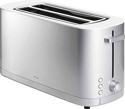 - Box contents: ZWILLING ENFINIGY Long slot toaster for 4 short or 2 long slices, 1800 W. 3 automatic programs (reheat, defrost, bagel). 7 levels of toasting, integrated cord storage, Cleaning: Empty the easily removable crumb tray. Dimensions: L41 x W17 x H21 cm. Net weight: 2.8 g, Item number 1005780, Material: Steel, Colour: Silver.